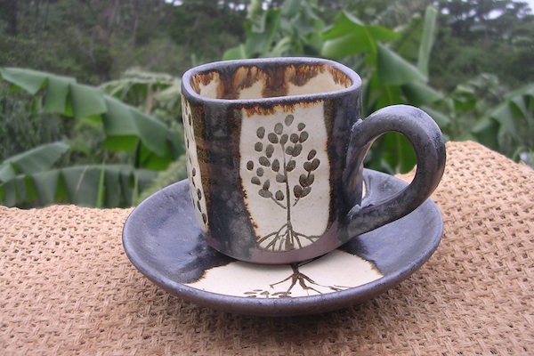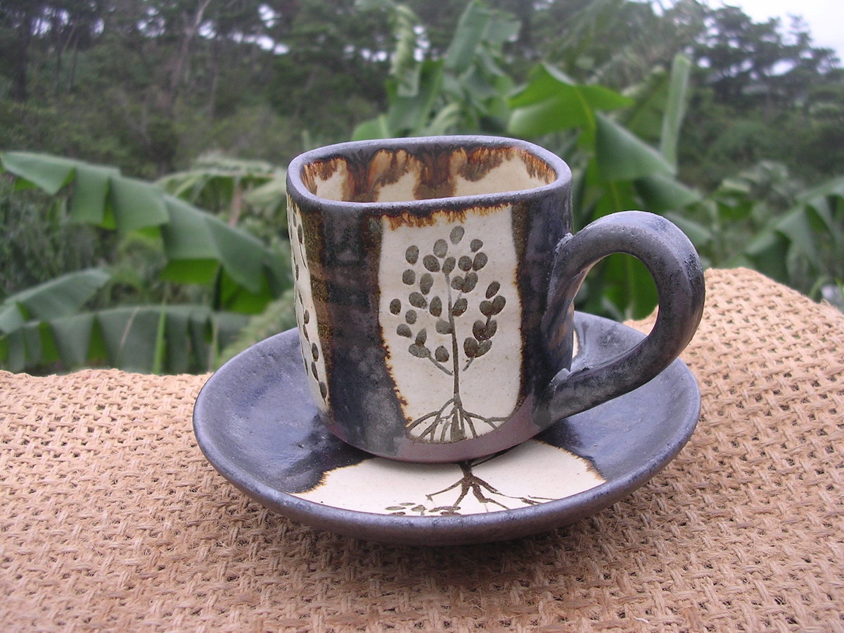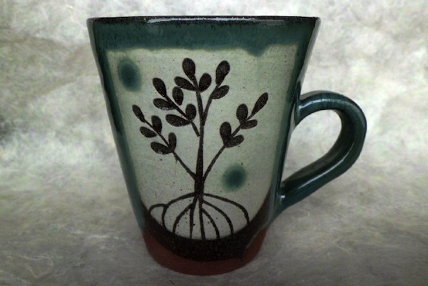 河口の汽水帯のドロの上に何本もの根を張り出し幹を支えています。陶器に彫られたヤエヤマヒルギの木は西表島の川をイメージしています。